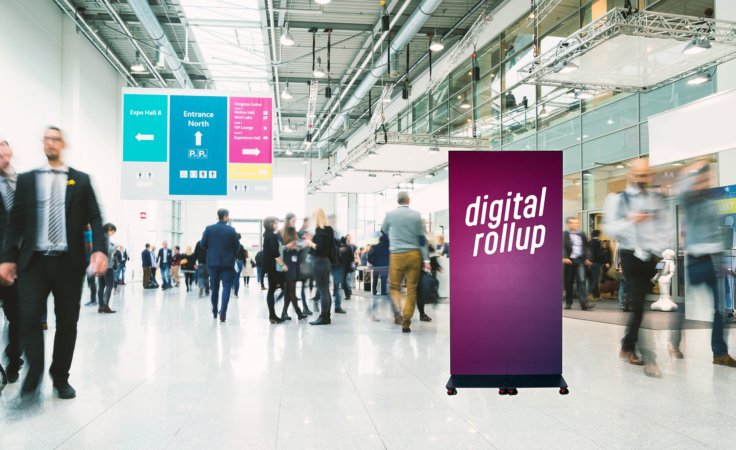 Ob am Point of Sale, in der Hotellobby, im Konferenzsaal oder auf der Messebühne: Das Digital Rollup bringt deine Inhalte dorthin, wo sie gesehen werden sollen – flexibel, modern und aufmerksamkeitsstark.